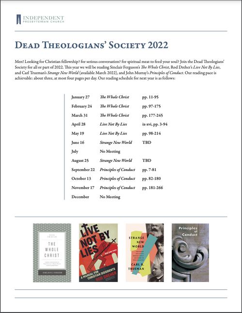 The 2022 reading schedule for the Dead Theologians' Society can be viewed below. DTS is a men's reading club that meets once a month during a lunch hour. If you want to receive reminders and updates, please contact the Senior Minister's Secretary by email (erustine @ ipcsav.org) or telephone (912-421-8100). By clicking the image below, you can print a pdf copy of the calendar. Dates are subject to change.