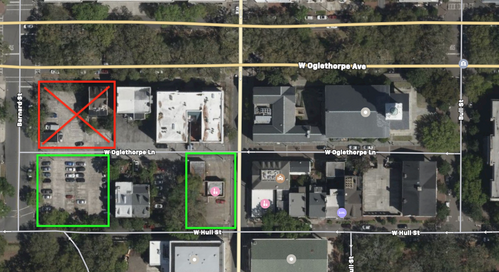 We have swapped properties and no longer own the northwest corner/guard shack lot. We now own the former beauty supply building (Hull & Whitaker) and the 40 spaces at Jackson Ward Lot West (Hull & Barnard). As of November 1, please do not occupy the 15 spaces on the property where the guard shack and 123 W Oglethorpe building are located.