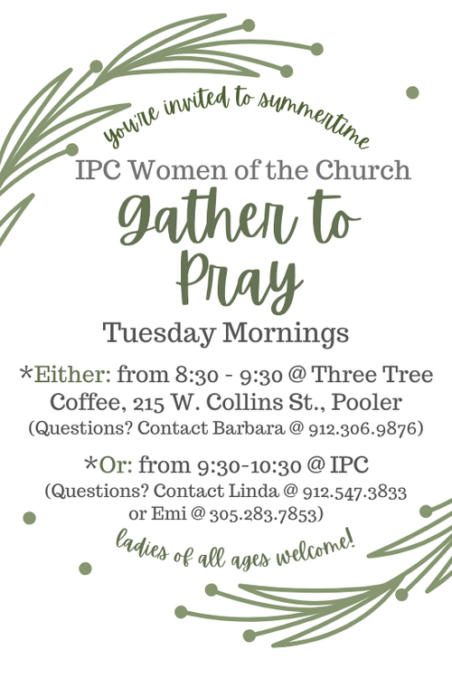 All women are invited to join us on Tuesday mornings either in Pooler at 8:30 AM (Three Tree Coffee) or downtown at 9:30 AM (at IPC). Contact Barbara Rustine for details about the Pooler meeting. Contact Linda DePue or Emi Steward with questions about the downtown meeting. These ladies information can be found in your online directory, Realm.